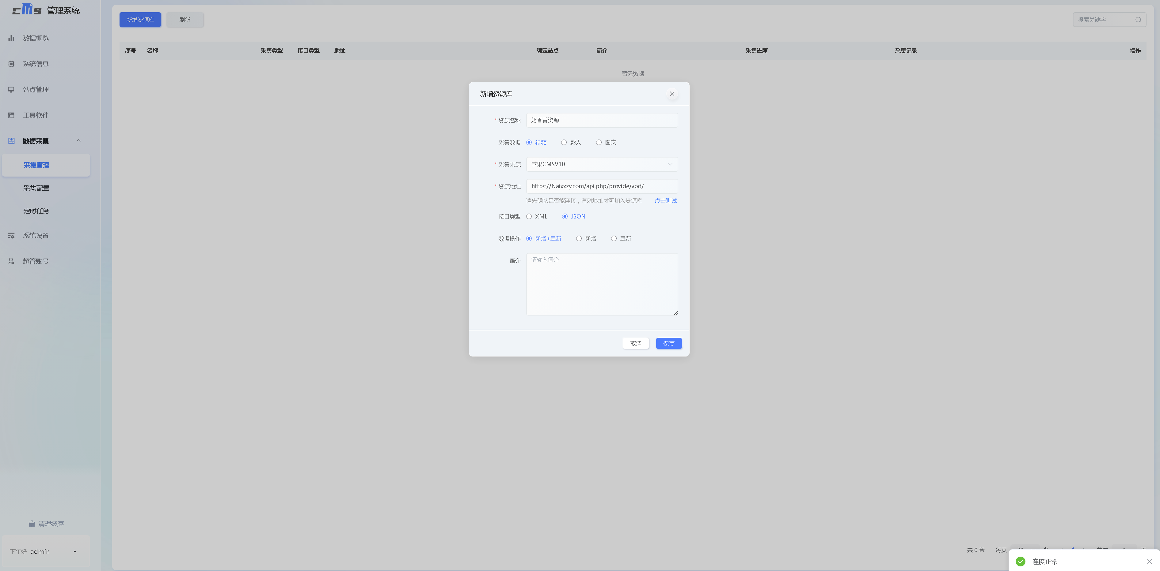请按以下步骤进行:依次点击【采集】-【添加资源库】,然后依次输入